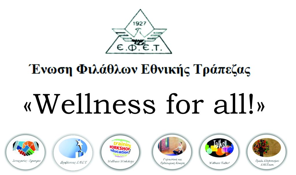 Από το 2018 υλοποιούμε το πρόγραμμα ευεξίας & ευ ζην “Wellness for all!” που βασίζεται σε corporate wellness πρακτικές και περιλαμβάνει -μεταξύ άλλων- μια σειρά στοχευμένων online fitness & wellbeing (in-house) δράσεων, τις οποίες επικοινωνούμε στα μέλη μας μέσω ανακοινώσεων που αναρτώνται στο Intranet της Εθνικής Τράπεζας, καθώς και μέσω του site μας (www.efete.gr).